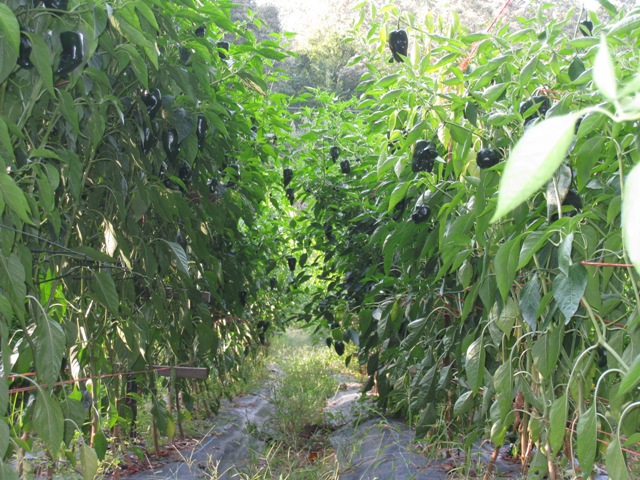 The hall of Poblanos, four layers of trellis this year as some of these plants are seven feet tall
