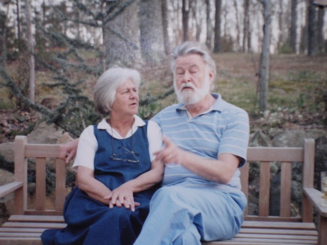 He took us to Connecticut where he started the Univ. of Conn. Medical School Library. Gardening continued to consume him and with the help of the “homegrown” work force he transformed a difficult hillside into a terraced wonder. During our stay in Connecticut he made a business trip to Chapel Hill and returned telling Mom that he found the place for them to retire and garden. A detour to Houston, Texas and the medical center library was the nadir of his gardening life. Miserable climate and soil on a quarter acre suburban lot. One Christmas we had railroad ties and top soil brought in and we built him a garden. 8 feet by 16 feet and two feet high he would come home from work, make a drink and go out and work in the garden, it helped keep him sane. Finally he became director of the UNC Medical Library and his garden dreams unfolded. The house that they remodeled and he designed and the gardens became the culmination of a lifetime of moving, travel and collection. Over three acres of rolling terrain, granite boulders and mature hardwoods eventually would comprise the gardens. Early on Betsy and I helped build the bones of the place with rock walls, raised beds, brick patios, pergolas and more. Betsy spent many days with him going to nurseries and others gardens feeding their plant lust. For those of you fortunate enough to visit the place and eat Mom’s food understand how they could influence ones life. The picture below, while not crisp, is typical. Pop sitting in the garden holding court with friends while Mom looked at him, trying to figure out where he was headed. We will all miss them both, and we thank all of you we have talked to since his death.