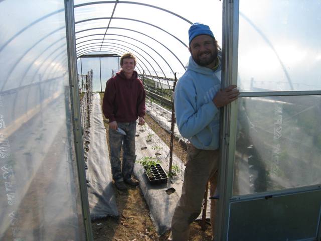 Alex ready to pull a tunnel off tender lettuces and over prepared beds